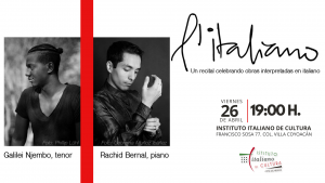 L’opera italiana ritorna all’auditorium dell’Istituto Italiano di Cultura con questo recital del duo Galilei Njembo (tenore) e Rachid Bernal (pianoforte). La diffusione della musica classica e dell’opera è una delle attività più importanti dell’Istituto e in questa occasione proponiamo al nostro pubblico un concerto con un tenore namibiano e un pianista messicano, che eseguono opere […]
