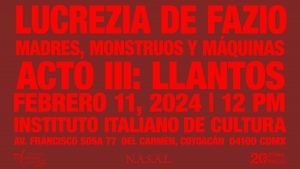 Madri, Mostri e Macchine è un progetto di ricerca ed esplorazione artistica caporale diretto dall’artista Lucrezia de Fazio e diviso in 3 atti che interroga il interrelazioni tra i concetti di madre, mostro e macchina. Il terzo capitolo di Madri, Mostri e Macchine intitolato Atto III: Pianti, sarà presentato l’11 febbraio all’Istituto Italiano di Cultura […]