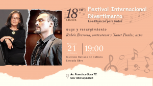 Il Festival Internacional del Divertimento questo 21 febbraio delizierá l’udito del pubblico dell’Istituto Italiano di Cultura con il concerto del controtenore messicano Rubén Berroeta accompagnato all’arpa dalla Maestra Mtra. Janet Paulus. I due artisti ci guideranno in un viaggio musicale che va dal XVII secolo ai giorni nostri, dall’Europa al Messico. Programma: de la Ópera […]