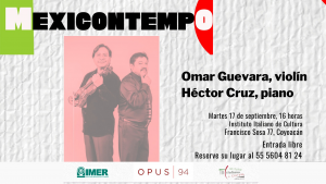 Il 17 settembre non perdetevi il nuovo appuntamento con la musica dal vivo proposta da IMER Opus 94, 94.5 FM. I musicisti di Oaxaca Omar Guevara Sánchez (violino) e Héctor Cruz Espinosa (pianoforte), presentano nell’Auditorium dell’Istituto Italiano di Cultura un recital di musica messicana composto da: Acuarela (per violino e pianoforte), di Gerardo Meza Sánchez; […]